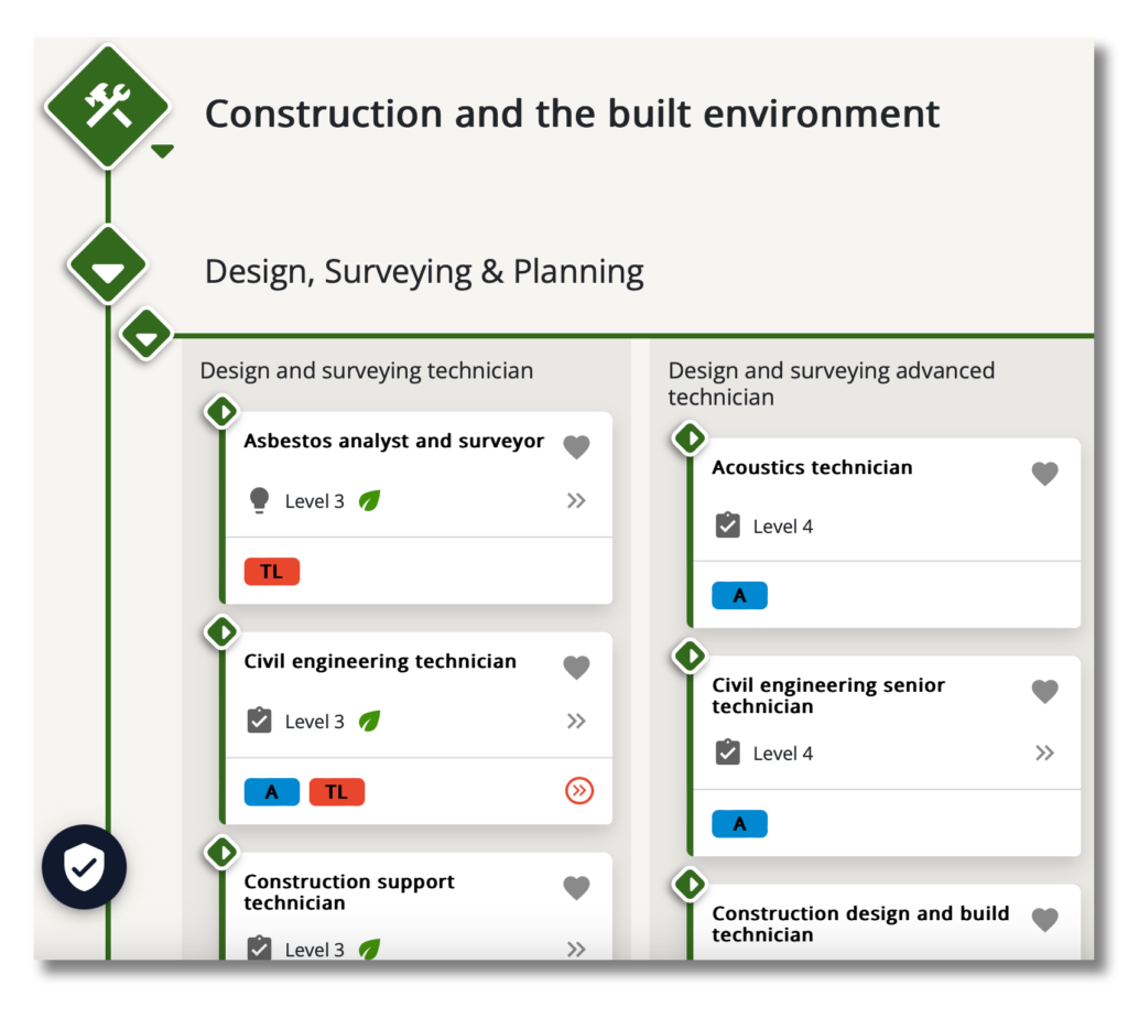 The maps group together occupations with related knowledge, skills and behaviours (KSB’s) into 15 routes. This makes it easier to see how they relate to one another. These are known as maps because they help people navigate the technical education landscape.