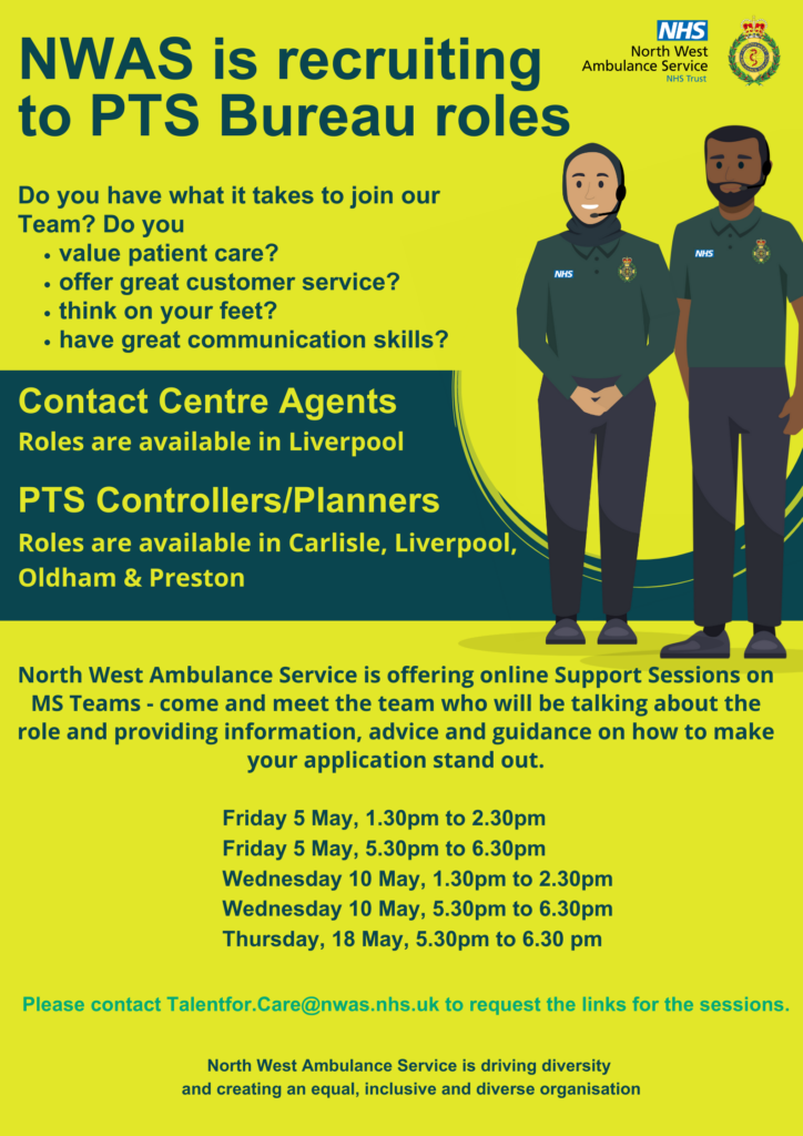 North West Ambulance Service is offering online Support Sessions on MS Teams – to meet the team who will be talking about the available roles and providing information, advice and guidance on how to make your application stand out.